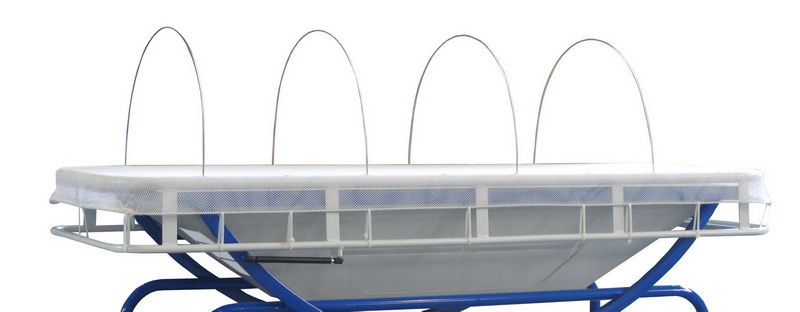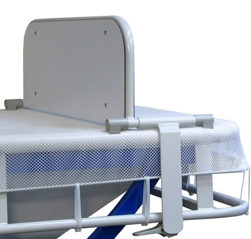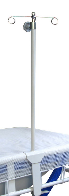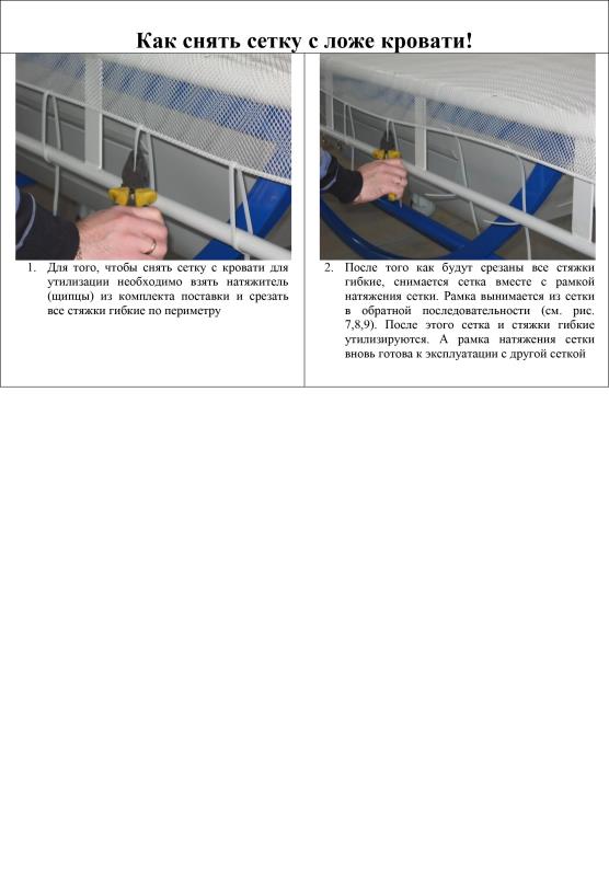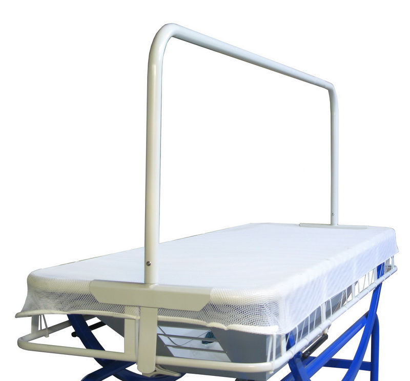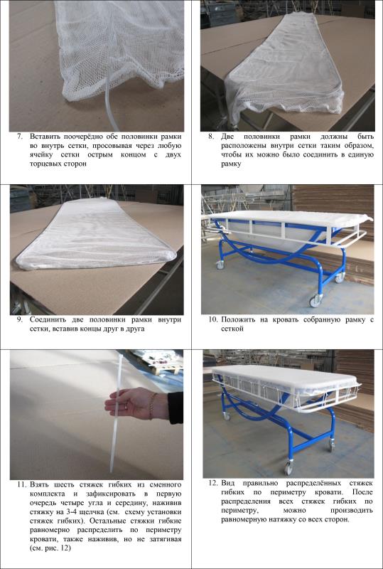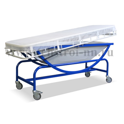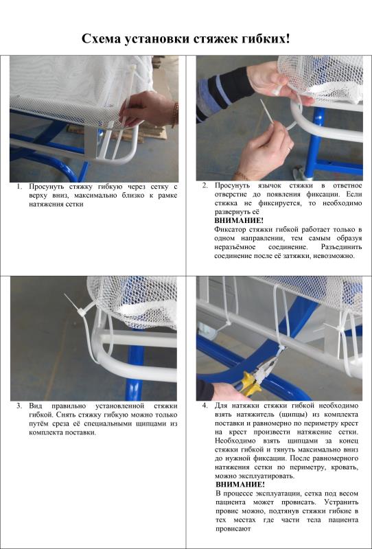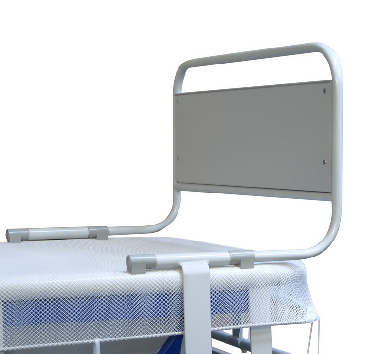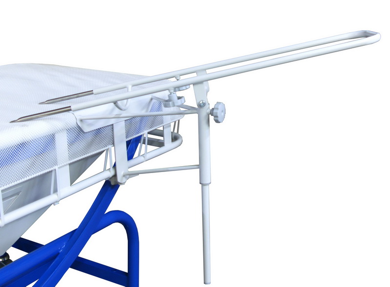 Габаритные размеры кровати: 2250х788х880 мм. 1. часть комплекта, основание – состоит из согнутой «П» образной трубы 38*1.5 мм и двух перемычек 40*25*1.5 мм. К основанию крепятся четыре самоориентирующихся колеса диаметром 125 мм, два колеса из которых с тормозом. На нижнюю раму по бокам привариваются две дуги, выполненные из вальцованной профильной трубы 40х25 мм, радиусом 1085 мм, к которым сверху приваривается нижний ярус ложе второй части комплекта. Все металлические части покрыты полимерно-порошковой краской синего цвета. 2. часть комплекта представляет собой нижний ярус ложе, выполненный из профильной трубы 40х25х1,5 мм, который служит силовым каркасом и опорой для установки поддона и верхнего яруса ложа. Поддон имеет трапециевидную форму размером 1989х706 мм, изготовлен из листа, толщиной 1 мм, который имеет 2 боковых окна размером 887х150 мм с поворотными створками, открывающимися вовнутрь, при помощи петлей/шарниров, а так же 2 торцевых окна (жалюзи), для подачи теплого воздуха, размером 200х250 мм. Высота поддона 365 мм. 3.часть комплекта включает в себя верхний ярус, который выполнен из стальных, труб круглого сечения гнутой формы, диаметром 38 и 22 мм, толщиной 1,5 мм, двух перемычек из трубы квадратного сечения 20х20 мм, толщиной 1,5 мм, и полосы 40х150х4 мм. Верхний ярус соединен с нижним ярусом при помощи двух шарниров и имеет регулировку угла подъема ложа 0-40°, Подъем верхнего яруса осуществляется при помощи двух пневмопружин, для удобства при санитарной обработки кровати. Все металлические части покрыты полимерно-порошковой краской серого цвета. На верхний ярус-ложе натягивается сетка с ячейкой 5х5 мм, при помощи 25 гибких стяжек. Сетка комплектуется съемной рамкой, выполненной из нержавеющего прутка, диаметром 5мм и фиксируется втулками из нержавеющей стали диаметром 8мм. Рамка разборная, состоит из двух частей П-образной формы, для облегчения крепления сетки к верхнему ярусу-ложе. Дополнительная комплектация:  | Дуга Габаритные размеры: 732х5х425 мм. На ложе устанавливаются 4 дуги для предотвращения соприкосновения покрывала с телом пациента, поддержания температурного режима и стерильного состояния больного. |  | Ёмкость для жидкости Габаритные размеры: 530х325х100 мм. Емкость выполнена из нержавеющей стали методом штамповки, ставится в поддон кровати для сбора жидкости. |  | Карта пациента Габаритные размеры: 320х250х10 мм. Выполнена из химостойкого пластика под формат А4. |  | Подлокотник Габаритные размеры: 805х350х545 мм. Подлокотник состоит из двух частей, одевается на раму кровати и фиксируется эксцентриковым зажимом. Все металлические части покрыты полимерно-порошковой краской. |  | Полка съёмная Габаритные размеры: 486х300х360 мм. С торцевой части основания (нижней рамы) устанавливается съемная полка для установки обогревателя. Каркас полки цельносварной гнутой формы. Сверху на каркас установлена полка размером 250х300 мм. |  | Рама Балканского Габаритные размеры: 2250х38х700 мм. Рама Балканского гнутой формы. Рама проходит по всей длине кровати и фиксируется с торцов при помощи эксцентриковых зажимов. Все металлические части покрыты полимерно-порошковой краской. |  | Торец Габаритные размеры: 750х400х415 мм. На ложе кровати устанавливается торец, при помощи эксцентриковых зажимов. Вставка торца выполнена из ЛДСП толщиной 16 мм с кантом ПВХ. Все металлические части покрыты полимерн