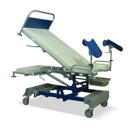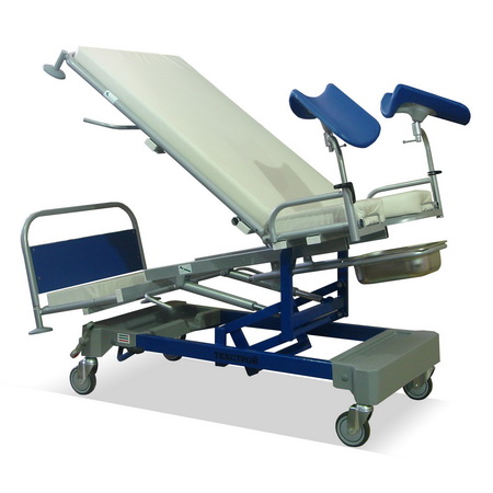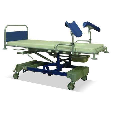 Кровать предназначена для акушерских процедур и родовспоможения. Кровать имеет три секции с регулировками спиной секции и Тренделенбург. Оборудована выдвижной нержавеющей емкостью и парой подколенников. В стандартной комплектации быстросъемный торец (1 шт.). Колеса диаметром 125мм с системой центрального тормоза (3+1). Ножная секция снимается. Регулировка к горизонтали : - Спинная секция 0-60 (пневмопружина)
